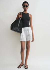 TOTEME shorts topstitched in black with our distinctive monogram. They are woven from organic cotton blended with Lyocell to a relaxed, straight-leg silhouette inspired by classic pajamas and are ...