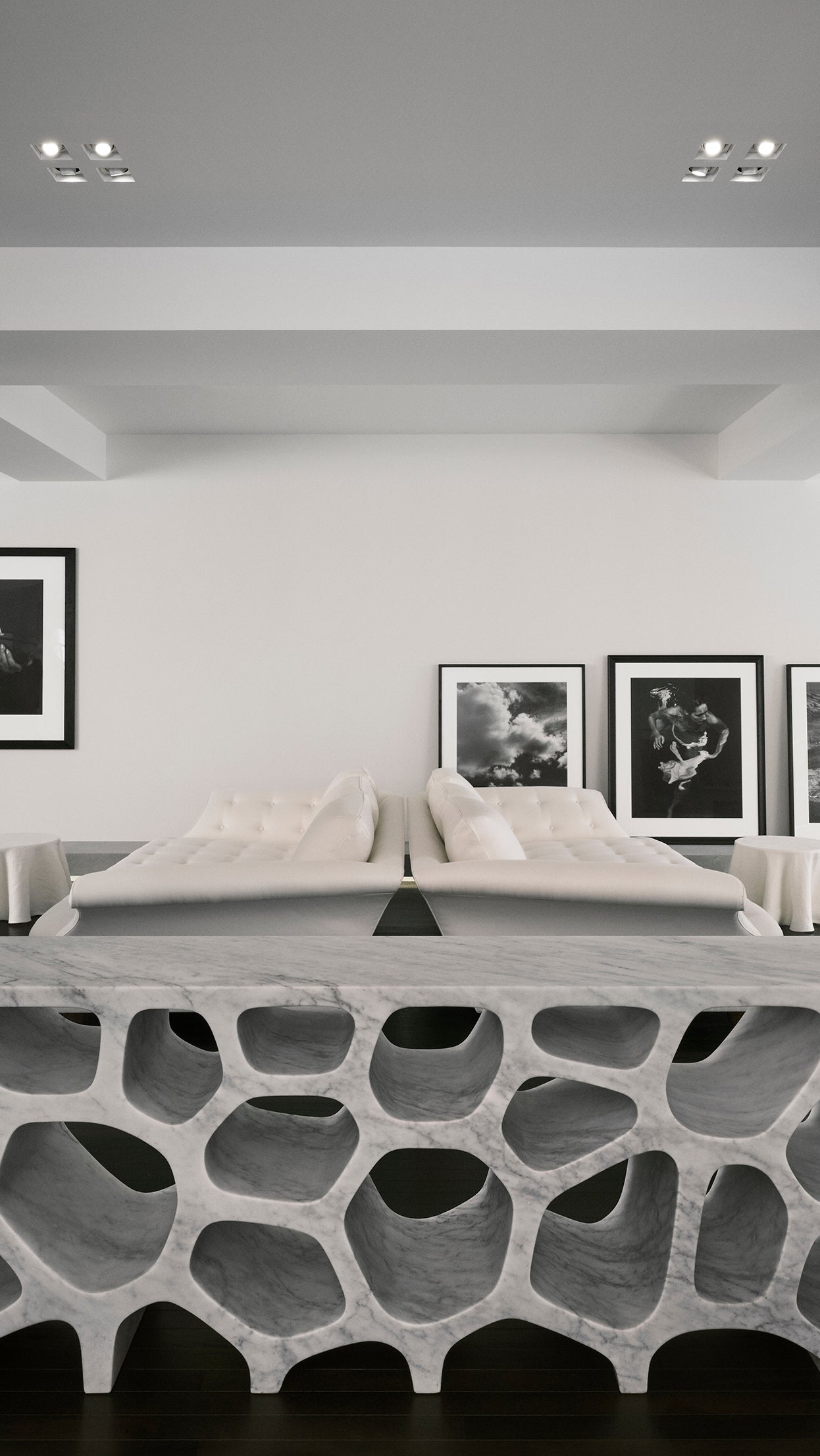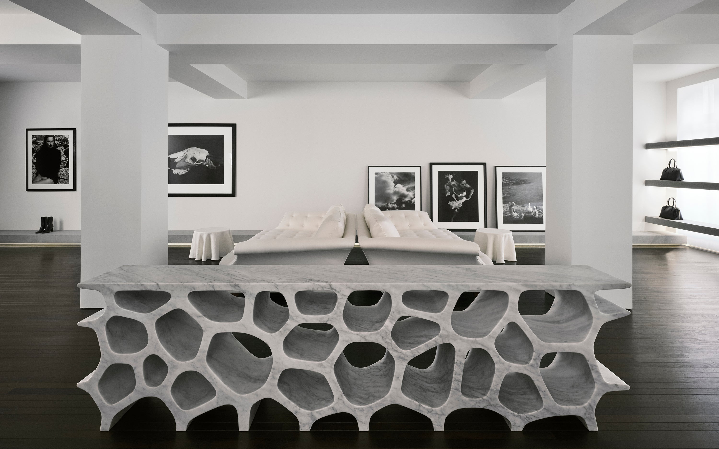 Carved from a slab of Carrara marble, ‘Low Voronoi’ by Marc Newson for Gagosian grounds the upper floor. A Swedish Baroque table refinished in soft white is set with a glass bowl by Ingegerd Råman for Orrefors. Liljevalchs sofas by Josef Frank for Svenskt Tenn and minimal Italian limestone shelves enhance the relaxed atmosphere.
