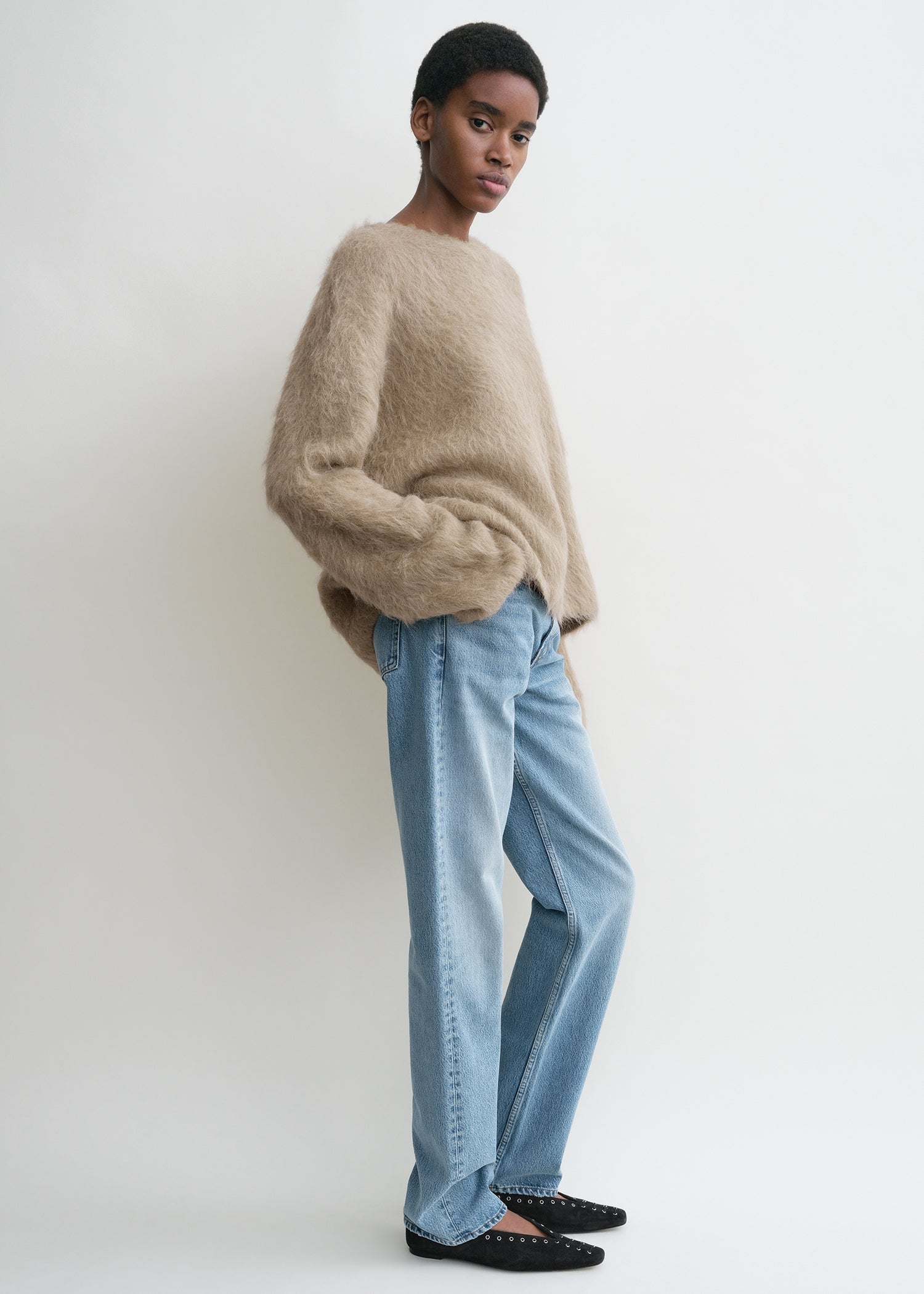 This crew-neck version of our recognizable boxy knit has an extra-wide silhouette for a cozy feel that is distinctive of TOTEME. It is knitted from mid-weight, hairy alpaca blended with recycled po...