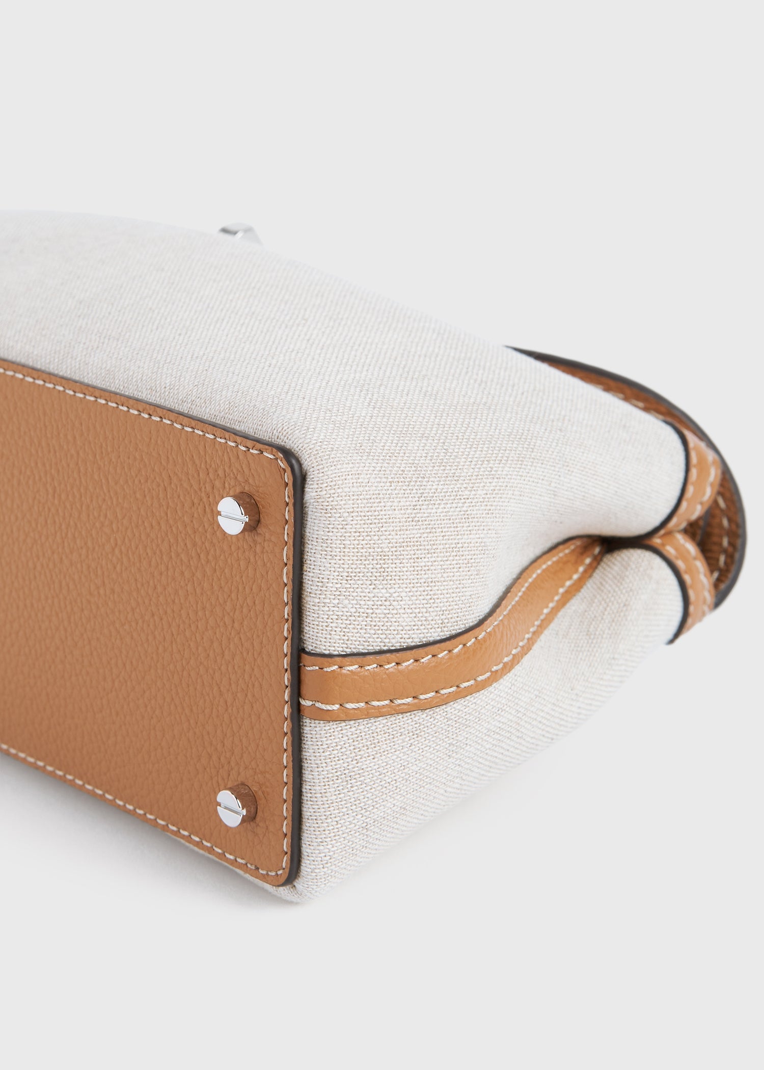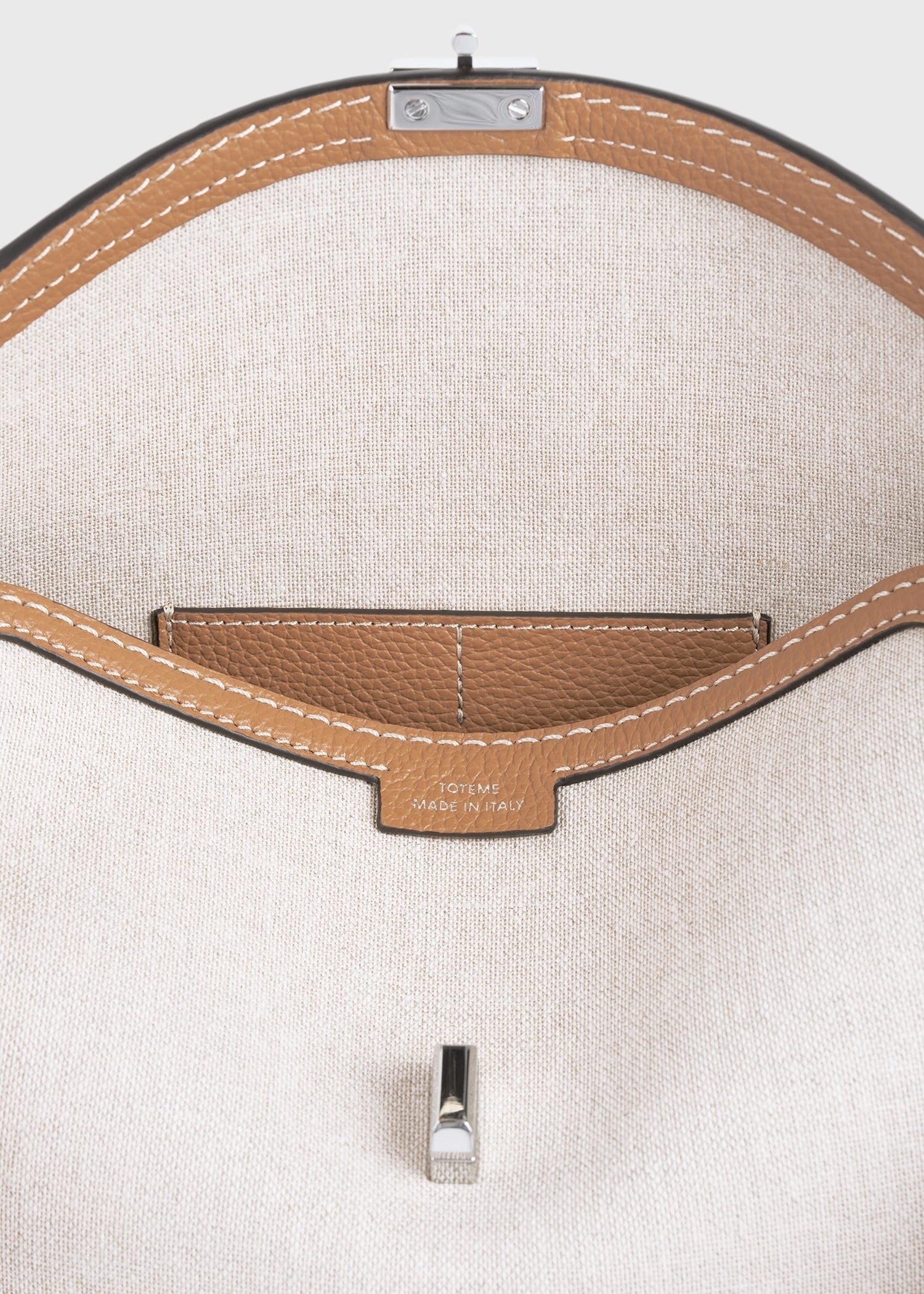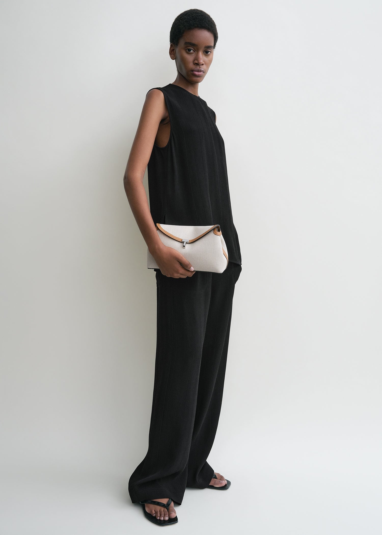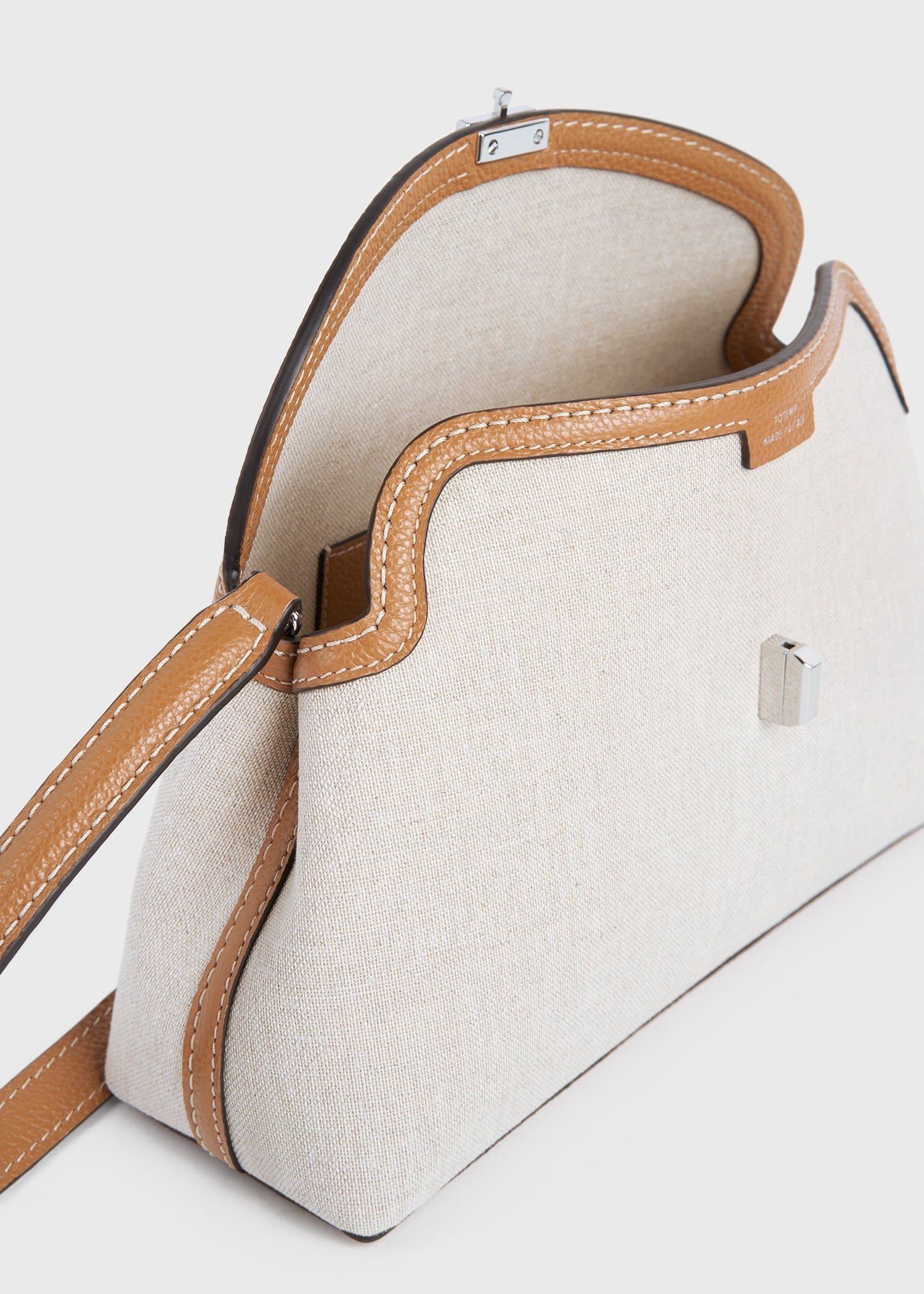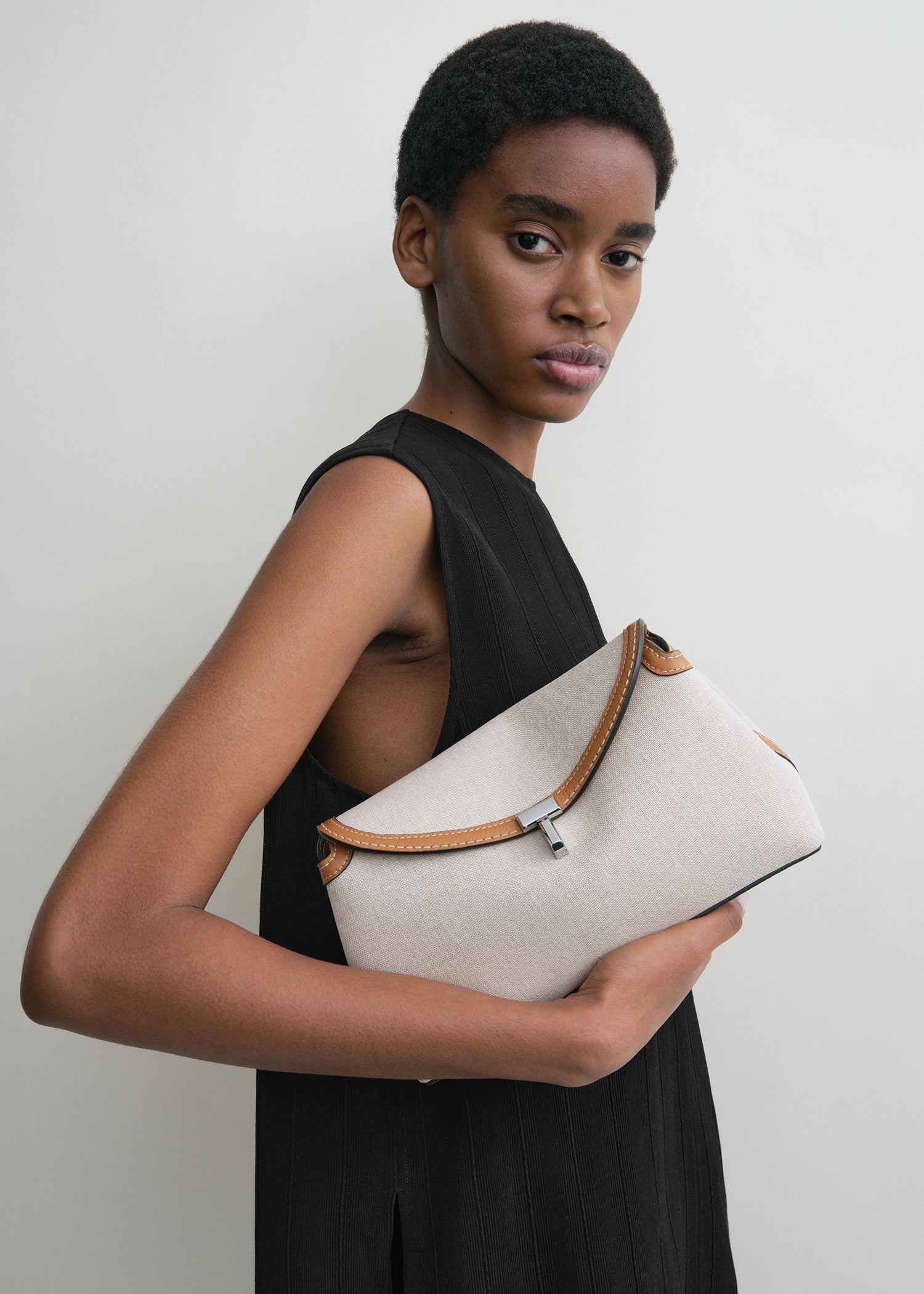 Sculptural TOTEME clutch bag named T-lock after the silver-tone metal twist lock securing the curved top flap. It is crafted in Italy from cotton-blend canvas finished with tan-brown leather and fi...